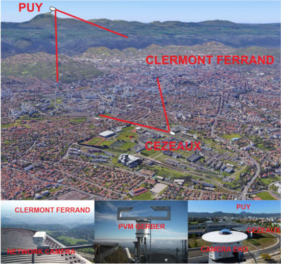 Two network cameras are in operation—one at the Cézeaux site looking towards PUY, and the other at PUY looking towards the Clermont-Ferrand area. Cézeaux is a campus at the University Clermont Auvergne, located south of the Clermont-Ferrand city, at an altitude of 410 m a.s.l. PUY is the mountain station, located 12 km east of Cézeaux, at an altitude 1465 m a.s.l. (Figure 1).