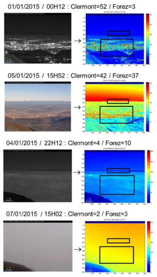 Examples of images and MATLAB processing outputs for different situations, from top to bottom: night time clear sky, day-time clear sky, night-time sea of clouds, and day-time cloud. The two zones are indicated with black rectangles, and the days and hours and standard deviation values in the two areas of Clermont (bottom large rectangle) and Livradois-Forez (top little rectangle) are given on the top of each image.