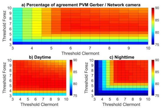 Figure 3 presents a sensitivity analysis applied to the total set of images (2013–2018). The maximum agreement is obtained with a threshold value of 6 for the two zones (Clermont and Livradois-Forez). Agreement is obtained by dividing the number of cases where the two systems (camera and PVM) obtain the same result (cloudy or clear sky) by the total number of coincidences (the time difference between the image taking and the PVM measurement is less than 2 min). The detection of clouds depends on the signal to noise ratio of the camera, which may be different during the day and night. In order to check the robustness of the method during day and night, we have also applied a sensitivity analysis only for daytime (Figure 3b) and nighttime (Figure 3c) images. The results show that a threshold value of 6 correctly separates cloudy and clear sky situations, as well as day and night (between 85% and 90% agreement). Since the threshold value of 6 separates a cloudy situation from a non-cloudy situation, we consider that below 5.5 the image will be considered cloudy, above 6.5 it will be considered cloudless, and between these two values it will be considered indeterminate.