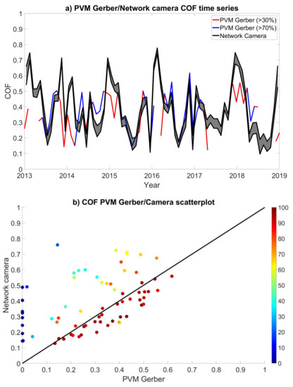 (a) Cloud occurrence frequency (COF) monthly time series calculated from camera images in black, with PVM Gerber in red. The lower limit of the camera curve is obtained with the threshold value 5.5, and the upper limit is obtained by adding the cases classified as “uncertain” with threshold values between 5.5 and 6.5. The PVM Gerber points with less than 30% of validated available data have been removed, and the PVM Gerber points with more than 30% and 70% are in red and blue, respectively. (b) A scatterplot of the monthly cloud occurrence from the camera images (threshold value at 6) as a function of PVM Gerber. The color is the percentage of validated PVM Gerber data per month, and the line y = x is in black.