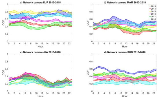 (a) Network camera DJF 2013-2018; (b) Network camera MAM 2013-2018; (c) Network camera JJA 2013-2018; (d) Network camera SON 2013-2018. COF obtained from the camera image processing separated by seasons and years as a function of the hours of the day (UTC). For each year and season, the uncertainty interval has been estimated similarly to Figure 4a. The correspondence between the colors and years is given in the top-right corner.
