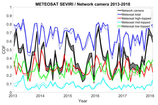 The seasonality of COF obtained by the camera analysis (maximum clouds in winter and minimum in summer) is also seen in the METEOSAT-SEVIRI total COF but with a smaller amplitude. For example, the difference between winter and summer on the total COF is only between 0.10 and 0.30. The METEOSAT-SEVIRI low-topped cloud curve is the closest to the camera COF curve (correlation coefficient of 0.60), but the winter maximums are underestimated. In winter, peaks in the webcam COF curve coincide with peaks in the low-topped COF serie but also with peaks in the high-topped COF serie. This is in agreement with the more frequent occurrence of large cloud systems associated with disturbances during this season [28]. In this large-scale cloud system, thick upper clouds prevent the detection of low clouds with METEOSAT-SEVIRI.