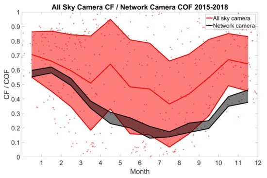 We have also compared the COF deduced from the camera analysis to the CF calculated with the algorithm ELIFAN [18] applied to the all-sky camera images taken at the Cézeaux site from December 2015 to June 2019 (Figure 8).