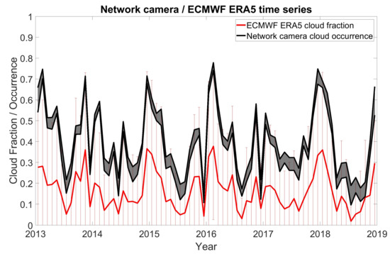 The comparison with the monthly fraction of cloud cover from the ECMWF ERA-5 reanalysis shows extremely correlated variations (a coefficient correlation of 0.93) but a mean shift of 19%, with larger values for the camera COF than the ECMWF ERA-5 fraction of cloud cover. Despite this shift, the camera COF values remain in the range of ERA-5 +/− one standard deviation.