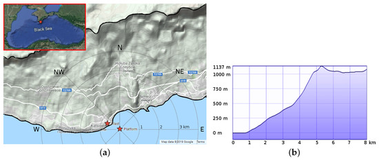 The described picture, however, does not take into account the topography of the coastal slope, which can have a critical effect on the local wind. The platform is located near a coast with a steep slope (with an average slope of about 200 m per 1 km distance) close to a plateau (Figure 1a). A topographic profile of the coast extending north from the platform is presented in Figure 1b. The presence of the steep coast could lead to the occurrence of katabatic and anabatic slope winds having the same direction as the breeze: during the day, from the coast up the slope (i.e., from sea to land), and at night, from the mountain down to the coast (i.e., from the coast to the sea, like the night breeze). This could, ideally, lead to a stronger breeze. A small glen runs north from the platform (from the coast to the edge of the plateau), which could help to establish a daily mountain–valley circulation, from the north at night and from the south during the day. However, in general, the complex topography of the coast can also lead to the destruction of the ideal breeze circulation.