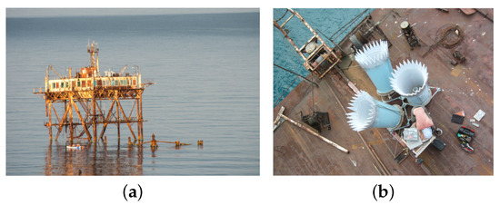 A general view of the platform is shown in Figure 2. In order to minimize the influence of the platform, the equipment was placed on the upper deck. We used the 3-beam Doppler minisodar Latan-3m, which was developed at the A.M. Obukhov Institute of Atmospheric Physics (Moscow, Russia) [38]. The sodar was operated with three 60 cm dish antennas at sounding frequencies of 3.3–4.4 kHz. The operating mode with frequency-coded sounding pulse [39] and parallel operation of the antennas was used to achieve a high temporal resolution. Different frequency coding was used to avoid cross-talk in the antennas: each antenna used an individual set of six frequencies emitted as a series of 50 ms pulses, which resulted in a vertical resolution of 10 m. The accuracy of the ABL parameter measurements with Latan-3 sodar was repeatedly verified by comparison with local measurements (see, e.g., [40]), and complied with generally accepted standards: ±0.5 m s for horizontal wind speed and ±5 degrees for wind direction. The antennas were mounted at 14 m above sea level (a.s.l.), one vertically pointed and two inclined and directed to the open sea. Accordingly, the lowest sounding level was 24 m above sea level. In Latan-3 sodars, the echo signal from each sounding is processed separately. Information of the instantaneous signal and noise intensities and the along-beam radial wind speed component are stored for each of the three antenna’s range gates. During the campaign, the raw echo signals were stored to allow for further reprocessing, should it be necessary.