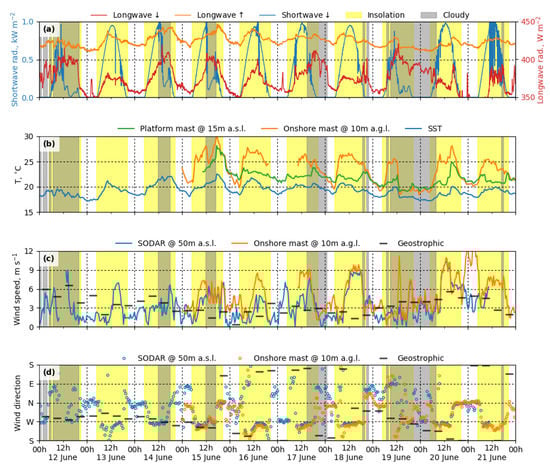 Figure 3 shows the time series of radiation budget, temperature, and wind speed and direction during the campaign. The periods of cloudy weather were determined from measurements of longwave and shortwave radiation (Figure 3a), according to Marty and Philipona [42]. Variations of the apparent emittance due to cloud cover significantly exceeded the variations of the clear sky emittance caused by variations of air humidity. We used the apparent emittance value as a criterion for determining cloudy periods. The threshold value of the emittance between clear sky and cloudy weather was chosen from the analysis of the time series of incoming shortwave radiation. In Figure 3, the identified time periods of cloudy weather are shaded (grey). The yellow bars indicate the local daytime periods. The cloudy days (12, 17, and 19 June) were excluded from the statistics. Figure 3b shows the time series of air temperature measured at the platform mast 15 m a.s.l., at the onshore mast 10 m a.g.l., and sea surface temperature (SST) obtained from radiometer measurements. Note that, during the entire experiment, the water temperature did not exceed the air temperature at 15 m a.s.l. Time series of the wind direction and speed from the data of sodar measurement and the onshore mast are given in Figure 3c,d, respectively. A steady west wind was observed daily during the daytime, with speed values of up to 12 m s at 50 m a.s.l. The night wind direction was less steady and generally ranged from the north-west to the east with typical speed values of about 2–3 m s at 50 m a.s.l. A rapid change in wind direction in the morning and evening hours was observed daily. The values of geostrophic wind speed and direction are also presented in Figure 3c,d, which were calculated from reanalysis data of sea level pressure by the United States National Center for Environmental Prediction (NCEP). During the experiment, the geostrophic wind direction was predominantly western and ranged from the northwest to the southeast. According to a quadrant classification (see, e.g., [43]), the geostrophic wind direction was generally from quadrants Q1 and Q3. The diurnal behavior of the probability density of the wind speed and direction, as well as the mean wind speed, is presented in Figure 4. The plots show a typical diurnal cycle of wind speed and direction, with dominant direction from the north for night hours (from 19:00 to 7:00 local time (+3 GMT)) and from the west (along the coast) for the daytime (from 7:00 to 19:00). The mean wind speed time course had two maxima: about 6 m s at around 03:00 and about 2.5 m s at around 15:00; and two minima: at 08:00 and at around midnight.