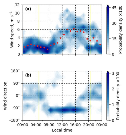 Diurnal behavior of the probability density of the wind speed (a) and wind direction (b) from the sodar at 50 m a.s.l. for days with fair weather. The red dots indicate the mean wind speed calculated for each time interval. Yellow lines indicate sunrise and sunset.