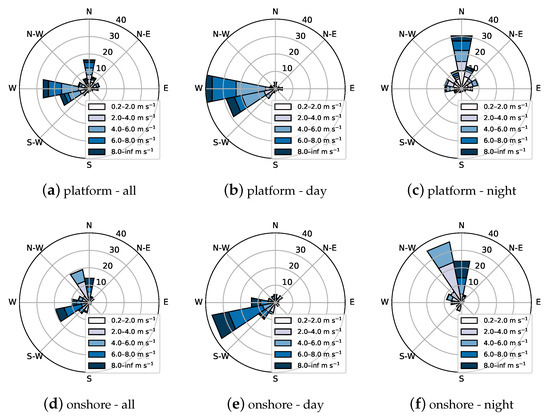 Wind roses near the surface for days with fair weather. (a–c) Wind from platform mast (15 m a.s.l.); (d–f) Wind from onshore mast (10 m a.g.l.). Left panels correspond to roses over the entire time; middle, for day hours (07:00–19:00 local time); and right, for night hours (19:00–07:00).