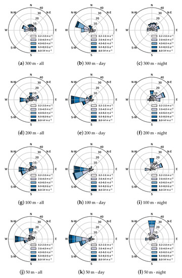 Windroses from sodar measurements for days with fair weather. (a–c) Wind at 300 m a.s.l. (d–f) Wind at 200 m a.s.l. (g–i) Wind at 100 m a.s.l. (j–l) Wind at 50 m a.s.l.