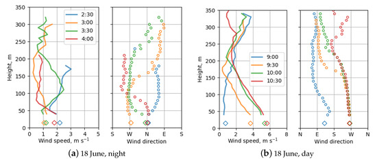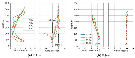 Half-hourly vertical profiles of wind speed and direction during steady winds from the north (a) and west (b). Diamonds indicate wind speed and direction measured at the platform mast at 15 m a.s.l.
