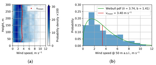 Figure 9a shows the wind speed probability density distribution with height. The mean wind speed did not exceed 4 m s at all heights up to 300 m and had a local minimum at about 150 m a.s.l., which indicates the presence of breeze circulation. The histogram of the probability distribution of the wind speed at 50 m a.s.l. is given in Figure 9b.