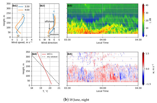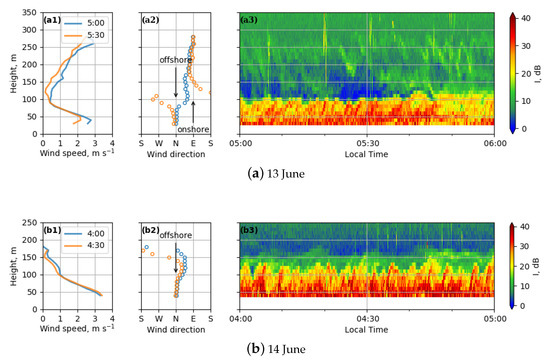 Two episodes of Kelvin–Helmholtz billows (KHB) observation in the nocturnal boundary layer under the north wind (offshore) near the sea surface and a return flow aloft (onshore) on the 13th (a) and 14th (b) of June. Panels (a1,a2) and (b1,b2) present half hourly vertical profiles of wind speed and direction, and panels (a3,b3) present the sodar return signal in height–time coordinates (echograms). The colors show the relative intensity of the return signal. Note the opposite orientation of the billows in the lower and upper parts of the echogram in episode (a).