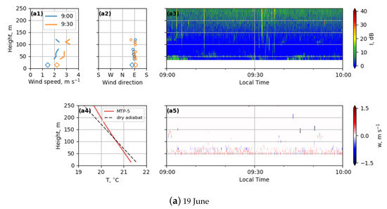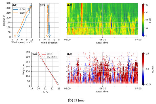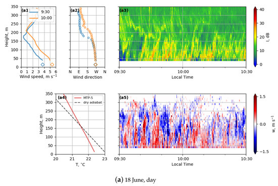 Kelvin–Helmholtz billows can lead to an increase in vertical heat and mass transfer due to the generation of turbulence [46]. Indirectly, the degree of vertical exchange can be judged by a vertical velocity field. The echograms with KHB structures and corresponding fields of vertical velocity obtained by the sodar are combined in Figure 11. A series of vertical profiles of wind speed and direction by sodar and temperature profile by the profiler are also presented in Figure 11. Dry adiabats are shown to estimate the temperature stratification. Figure 11a shows a matching for the case of wind direction changing from west to east with height. Two different wave layers can be observed. In the lower layer (up to 150 m), the wind speed decreased with height (about 2 m s per 100 m) and a wavy structure was observed as a series of quasi-periodic stripes, inclined to the right. In the upper layer (from 150–300 m) with increasing wind speed (about 2 m s per 100 m), the structure was observed as stripes tilted to the left. The temporal period of the observed structures was about 2 min, which is equal to a spatial period of about 250 m. In the vertical velocity fields presented, alternating areas of ascending and descending flows are visible; matching the shape of turbulent structures in the field of the sodar return signal. Figure 11b shows the case of a complex wave structure in several layers, with time periods of 1–3 min.