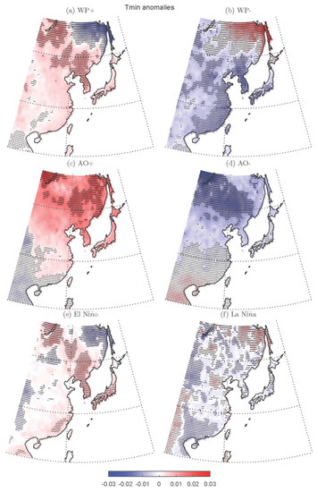 Minimum surface air temperature (Tmin) anomalies (red and blue shading) over East Asia during the winter months from 1979 to 2017 in dependence of the strong positive or negative phase of teleconnections: (a,b) for Western Pacific pattern (WP) patterns; (c,d) for Arctic Oscillation (AO) patterns; (e,f) for El Niño-Southern Oscillation (ENSO) patterns. The grids with dots indicate the values lower than the 0.2 quantile or higher than the 0.8 quantile.