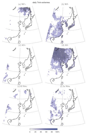 The percentage of daily cold extremes in dependence of the strong positive or negative phase of teleconnections: (a,b) for WP patterns; (c,d) for AO patterns; (e,f) for ENSO patterns. Shaded grids with blue are significantly higher than expected chance (25%) at a 95% confidence level for percentages. The grids with dots indicate the values higher than 35%.