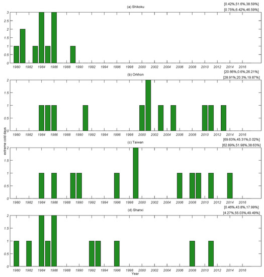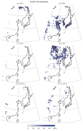 The trend of extreme months has some commonalities with that of days for four locations (Figure 10). In particular, all of the monthly extremes from 1980 to 1989 fall in the interval of the WP index less than 0 for the Shikoku case. A similar state appears in the example of Taiwan with the ENSO. That suggests the dominant teleconnections are greatly influential on the monthly Tmin in these locations, in spite of the patterns with relatively weak strength.