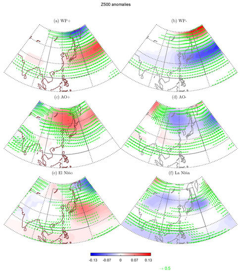 To explain the distribution of daily Tmin anomalies and extremes, the composites for Z500 and SST anomalies are shown in Figure 4 and Figure 5, respectively. During the positive (negative) phase of the WP pattern, the composite of Z500 displays a cyclone (anticyclone) in Kamchatka and an anticyclone (cyclone) in the western North Pacific. For the composite of Z500 in the positive (negative) phase of the AO pattern, a strong anticyclonic (cyclonic) circulation centers over the northern region within East Asia. It can be seen that the westerlies at the middle–high latitudes are stronger (weaker) than normal conditions in both cases. Meanwhile, the mid-latitude region within East Asia is governed by the warm (cold) and mild (dry) southerlies (northerlies). As for an El Niño event, an anticyclonic circulation is predominant over the western North Pacific. The south-easterlies and south-westerlies converge around Japan and the coast of East China, which are controlled by warm air. For the case in the opposite phase, the zonal cyclonic circulation prevails over the mid-latitude region of East Asia. The westerlies around 45° N are weakened by the cold air from the Arctic flowing southward into the lower-latitude area.