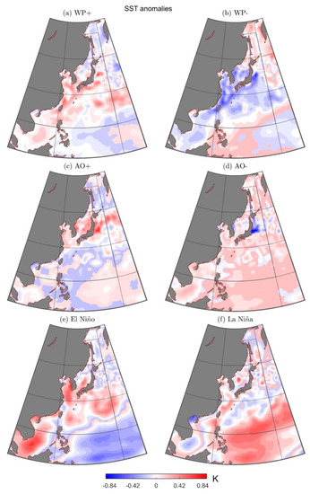 The composite of SST anomalies in the positive (negative) phase of WP exhibits the prominent warm (cold) anomalies over the western North Pacific, which is surrounded by the weak cold (warm) anomalies in the north and south, respectively. As for the positive phase of AO, the composite depicts the evident warm (cold) SST anomalies originating from the Yellow Sea and the Bohai Sea, passing through the Sea of Japan, reaching the western North Pacific. The SST anomalies at middle–high latitudes for the El Niño events have some commonalities with that in the positive phase of WP, but present strong cold anomalies in tropical West Pacific. In contrast, for a La Niña event, widespread warm anomalies appear over the entire western North Pacific and the anomalies in the tropical western Pacific warm pool are very strong.