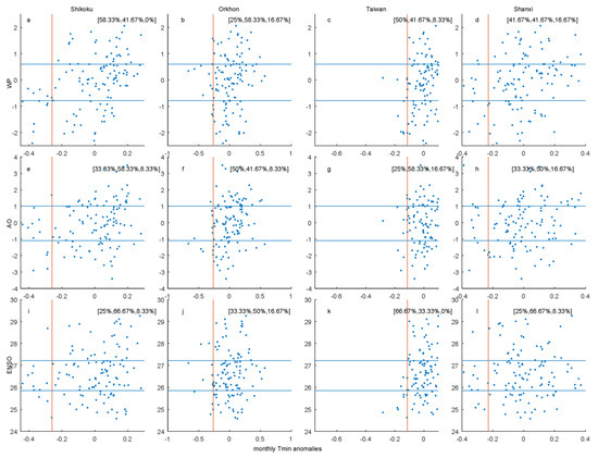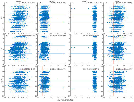 Scatterplots between the daily Tmin anomalies and teleconnection indices values for the individual cases: (a,e,i) for Shikoku during the negative phase of WP, AO and ENSO, respectively; (b,f,j) same as a, e, j, but for Orkhon; (c,g,k) same as a, e, j, but for Taiwan; (d,h,l) same as a, e, j, but for Shanxi. The scatterplots on the left side of the vertical red line represent the values at the lower 10% of the Tmin anomalies distribution. The horizontal blue lines present the upper and lower quartile of the teleconnection indices, respectively. The top-right-corner values from left to right represent separately the percentage of extreme days in the positive, normal and negative phases of modes.