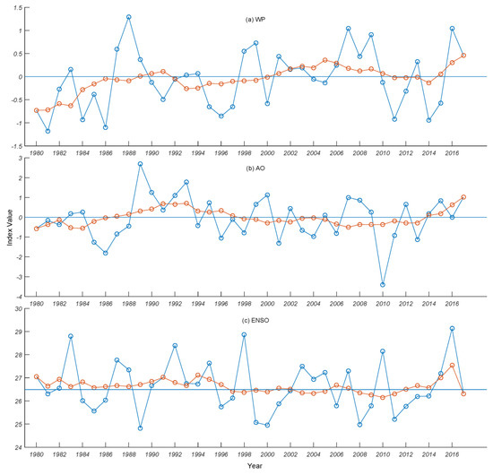 Time series of yearly teleconnection indices during winter of 1979–2017: (a) for WP; (b) for AO; (c) for ENSO. The blue and red lines present the raw sequence and its nine-year smooth result respectively.