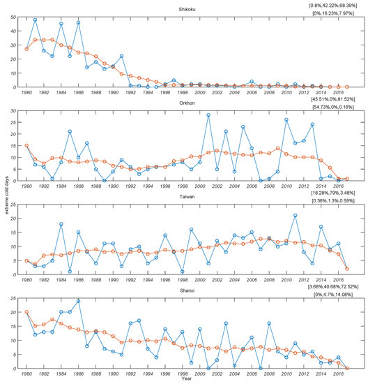 The time series of teleconnection indices and the number of extremely cold days are presented in Figure 8 and Figure 9. The blue and red line in Figure 8 represents the interannual and interdecadal variability, respectively. There is an increasing trend in the oscillation in the WP pattern. The strong WP-events appear frequently during the wintertime for the periods 1980–1986, 1994–1997 and 2010–2015. Correspondingly, the extreme cold events in Shikoku were relatively active from 1980–1986. Nevertheless, the number of extreme days experienced a decrease prominently around 1987. There were few cold extremes since 1992 except for 1997, 2006, 2009 and 2011. The cold extremes in Orkhon are frequently concurrent with the AO-events for the periods 1985–1987, 2001–2003 and 2009–2013. The observed extremes have a higher frequency in these years than others as well. In particular, the long-term variation exhibits the simultaneously reverse trend between the extremes in Orkhon and AO index. The phenomenon implies that extremes are subjected to the AO pattern at the interdecadal time scales. For the case of Taiwan, it can be seen that the interdecadal variability of extreme days tends to increase since 1999, while the ENSO index experienced an evident decrease in the same phase. Therefore, we conclude that the number of extreme days and ENSO index have a close correlation on the long-term variability. Moreover, we employed the Pearson analysis to test the significance of correlations at different time scales. Overall, the correlations between the extremely cold days on Shikoku, Taiwan and Orkhon and the relevant dominant patterns have high statistical significance at the 95% level. The significance is higher on the interdecadal scale than the interannual scale. Especially, we found Shanxi has a significant correlation with the WP pattern, while the case is not closely linked to the strongly negative phase of this teleconnection in Figure 2 and Figure 6. The correlation indicates that the extreme Tmin days in Shanxi maybe only depend on the positive or negative value of the WP index, regardless of the strength of the phase. On the other hand, there is a significant correlation between the daily extreme cold on Shanxi as well as Taiwan and the interdecadal AO index. The phenomenon implied that the AO pattern could trigger the temperature variability on the longer timescale in both locations. Similar situations were observed in the Orkhon case but for ENSO pattern.
