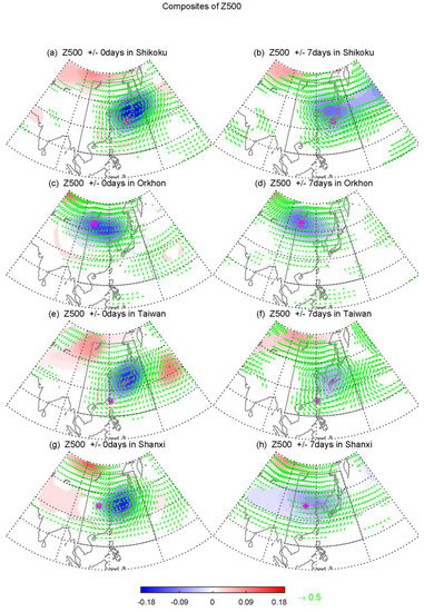 Composite maps of winter geopotential height anomalies at the 500 hPa level for the extreme day (the left column), and 15 days including 7 days before and after the extreme day (the right column) in the four locations (labeled by magenta stars): (a,b) for Shikoku; (c,d) for Orkhon; (e,f) for Taiwan; (g,h) for Shanxi.