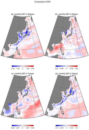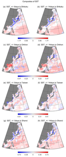 The SST anomalies composites for the four locations are shown in Figure 12. There are few distinctions between the composites for the extreme day and 15-day periods, because large heat capacity in the ocean causes its stability [22]. The spatial distribution of SST anomaly in the case of Orkhon generally resembles that in an AO- event (Figure 5d). This SST pattern means that the frequency of extreme days in Orkhon could increase on the longer time scale under the influence of the SST anomalies in relation to the dominant pattern. For the case of Taiwan, the SST anomalies around the tropical Pacific are not evident as that in a typical La Niña event (Figure 5f). Meanwhile, the Shikoku case displays the contractive cold SST anomalies around the Kuroshio region (10° N–34° N, 120° E–150° E) and striking opposite signs over the western Pacific Warm Pool (0° N–15° N, 125° E–145° E) which differs from the SST anomalies in the negative phase of WP pattern (Figure 5b). The composite for Shanxi has some commonalities with the Shikoku, but with relatively weak strength.