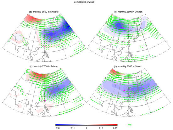 The composite analysis based on the Z500 anomalies is conducted to explore the relationship between the recurrent patterns and Tmin extremes depending on a different timescale. Figure 11 exhibits the anomalous Z500 composites for the extreme day, and 15 days including 7 days before and after the extreme day. Both cases of composite for the extreme day in Shikoku and Taiwan are identified with a strong cyclonic circulation downstream of the location as well as anticyclonic circulation upstream. This pattern is consistent with the wave train sign in the negative phase of WP. The composite of Orkhon presents the pronounced wave trains related to the AO-event. The wave trains also can be observed in the 15 day composites due to that the teleconnection usually lasting for multiple days. The composite of 15 days in Shikoku shows a significant difference with the composite of the extreme day. The cyclonic circulation becomes further elongated in the east–west direction and more closely resembles a typical WP-pattern (Figure 4b). Moreover, for the case of Orkhon, the AO-like pattern still persists strongly in the composite of Z500 anomalies with the 15 day period, even though the local atmospheric circulations are averaged out. That is indicative of that the local-synoptic patterns with the large-scale teleconnections triggering daily climate variability, whereas the large-scale patterns play a dominant role in the Tmin extremes for a longer period. In particular, the large-scale meteorological circulation is weakened evidently in the 15 day composites for Taiwan. The result suggests that the subtropical location is subjected more to local-synoptic systems than teleconnection patterns [21]. The composite for 15 days in Shanxi exhibits a similar change but the prevalent local weather events are primarily caused by the topography. Meanwhile, the anomalies in the composite for 15 days have a broader range compared to that for the extreme day.