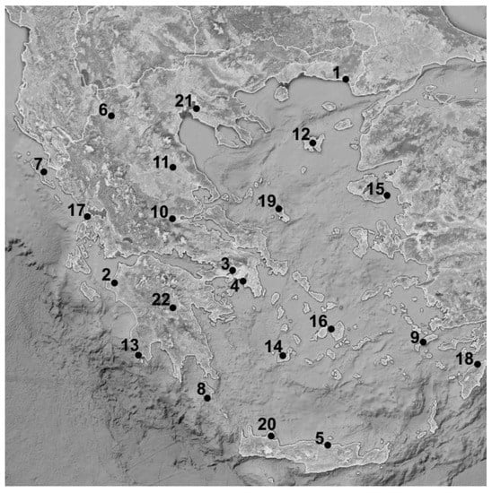 In this study, we used data from 22 meteorological stations of the Hellenic National Meteorological Service (HNMS) network. These stations are listed in Table 1, while their spatial distribution is illustrated in Figure 1. The main criteria for the selection of these stations are: a) the length of the time series, b) the time series completeness (i.e., having very few missing values) and c) the spatial coverage (effort was made to cover all climatic and topographic areas of Greece).
