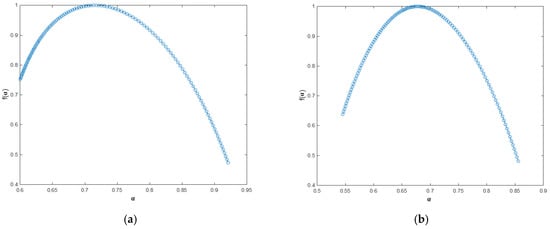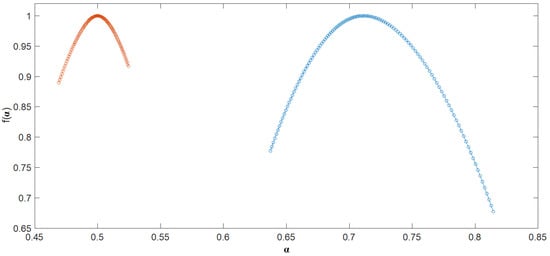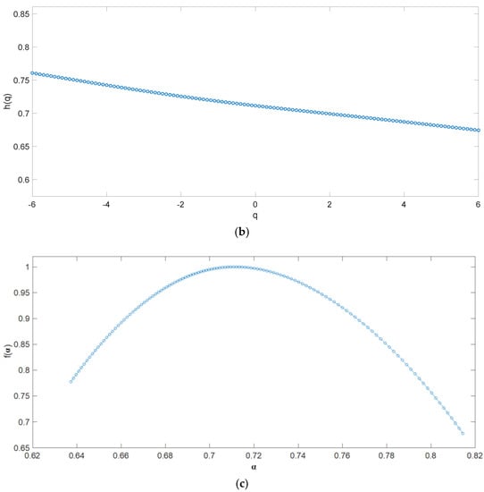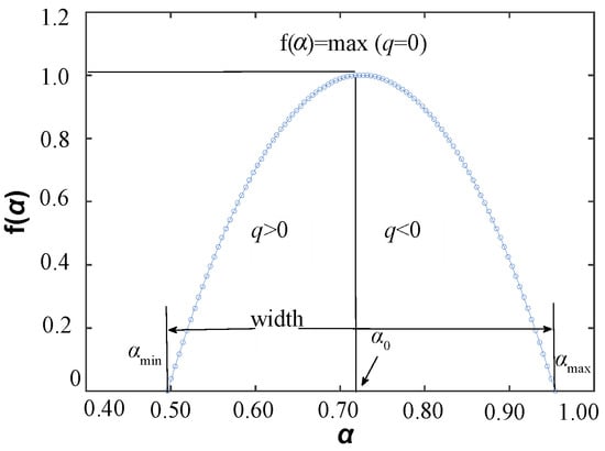 The quantity α is called singularity strength (or Hölder exponent) and f(α) expresses the dimension of the subset of the time series that is characterized by α. The plot of α versus f(α) is called singularity spectrum, or multifractal spectrum. Usually, this plot has the shape of an upside-down parabola as in Figure 2. From the multifractal spectrum we can draw significant conclusions about the multifractality of a time series. The value of α where f(α) becomes maximum is when df(α)/dα = 0 and this happens for q = 0. Then, from (4) we find that f(α)max = 1. This value of α corresponds to the most dominant scaling behavior [45] and it is the dominant Hurst exponent. Hereafter, this quantity will be denoted by α0.