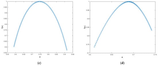 Representative multifractal spectra plots (circles) related to the truncation type for: (a) Tmin for Mitilini (case LL); (b) Tmax for Alexandroupolis (case L); (c) Tmean for Kos (case S); (d) Tmin for Herakleion (case R).