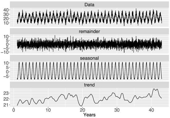 Prior to MF-DFA analysis, the STL decomposition method is applied to the temperature time series. The resulting components along with the original time series are illustrated in Figure 4.