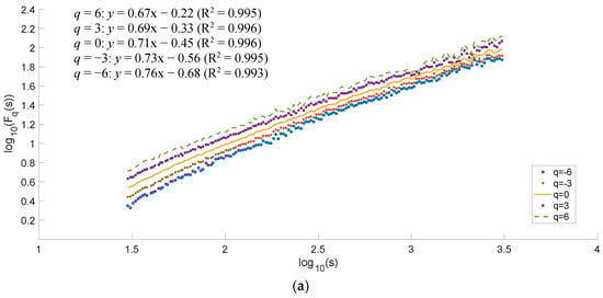 From the Fq(s) vs s log-log plots for all temperature time series of all stations, it is observed that they have the form of an almost straight line (i.e., constant slope). It is noteworthy that slope values decrease when q has greater values, i.e., in Figure 5 the slope is 0.76 for q = −6, while for q = 6 the slope is 0.67. Moreover, the coefficient of determination (Pearson correlation coefficient) for all q values is higher than 0.98, which means that these scaling exponents are considered to be representative of the underlying scaling phenomenon [52].