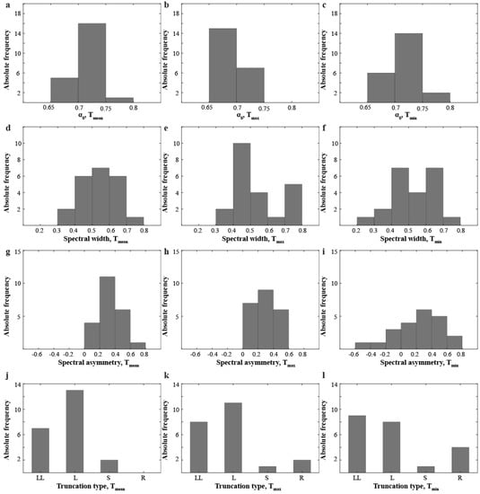 Histograms of absolute frequency for (a–c) α0; (d–f) spectrum width; (g–i) spectral asymmetry B; (j–l) truncation type.