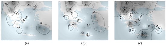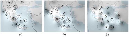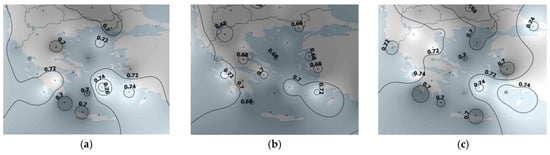 Regarding the spectral asymmetry spatial distribution, it is observed that the lower values of parameter B are found, in general, mainly in southeastern Greece. Spectra with higher B values contain a greater number of high fractal components and therefore, according to [47,48] are related to more ‘complex’ time series and it could be assumed that the pre-mentioned greater climate stability at the southeastern area leads to less ‘complex’ time series.