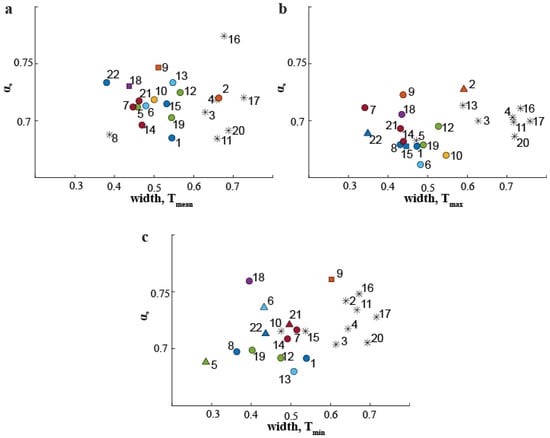 Scatter plots of spectrum width vs dominant Hurst exponent (i.e., α0 values) for (a) Tmean; (b) Tmax; (c) Tmin daily temperature time series, with respect to truncation type (LL: *, L: ●, S: ■, R: ▲).