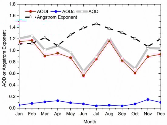 AE (440–870 nm) changes little with the value more than 1.0, which is similar to the previous research [,]. Convective precipitation occurs frequently in summer that the majority of coarse particles have been eliminated by wet settlement, but the fine particles remained in atmosphere with long suspension times [,,,]. Also, in Figure 2, it also can be illustrated by that the difference between and AOD is lowest in summer. The average AE is less than 1.2 in each month of spring. The main reason for the high AOD and low AE in spring is the long-distance transport of dust pollution from North China [,]. In addition, another reason may be the wind speed increasing, by which it can be speculated that large particles are emitted to the atmosphere or transported from other regions by strong wind [,].