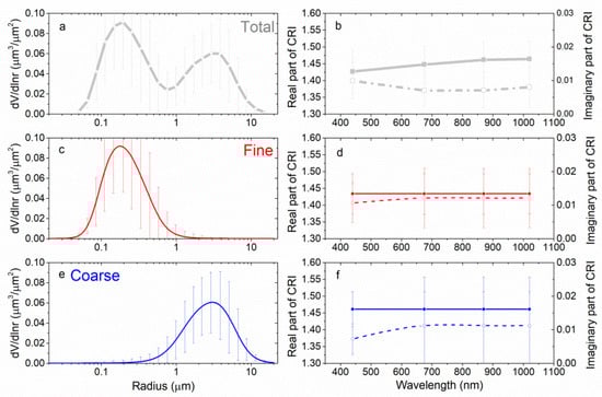 In Figure 4, we present the multi-year average separated CRIs and the breakdown results of VSDs. It can be seen the fine- and coarse-mode VSD are well separated. The pictures (a) and (b) in the first row are the average values retrieved from the ground-based Sun-sky radiometer over multiple years. The second and third rows are the average of fine- and coarse-mode VSD and CRI. The sub-mode real part of CRI has non variation of wavelengths referring to Equation (2). The total CRI and sub-mode CRI are from different algorithms [,,], but the sub-mode CRI is related to the volume modal concentration in the iterative algorithm of estimation of CRI for fine and coarse mode [].
