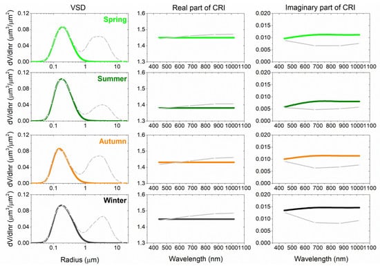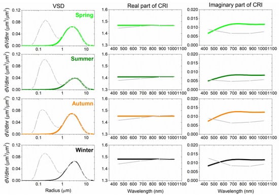 Seasonal variation of coarse-mode VSD and CRI in SONET Chengdu site. The grey line refers to the total parameters. The corresponding parameters are listed in Table 2.