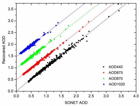 In order to evaluate the overall analysis scheme, a numerical experiment was used to assess the performance of sub-mode results. In Figure 7, we illustrated the recovery of AOD in four wavelengths by the sub-mode VSD and CRI. It can be seen that the correlation coefficients are all larger than 0.98. The absolute deviations in four wavelengths are 0.04, 0.02, 0.03 and 0.03, corresponding relative standard deviations are 0.03, 0.03, 0.06, 0.09, respectively. These biases are basically close to the claimed uncertainties of SONET products (AOD), which demonstrate that the sub-mode VSD and CRI results are acceptable in understanding of optical closure.