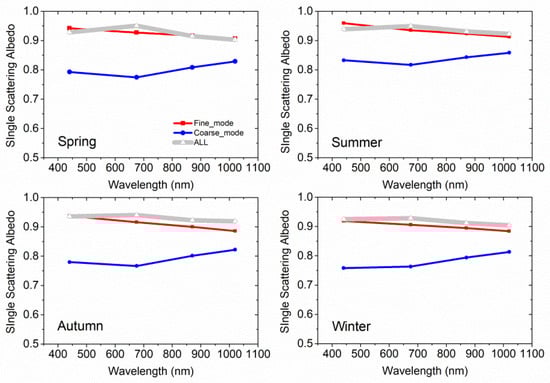 In Figure 8, the sub-mode SSA is calculated by the separated VSD and sub-mode CRI under ignoring the influence of nonsphericity on dust aerosols. The total SSAs are all larger than 0.9 in the four seasons and the fine-mode SSAs are closed to the total SSAs that indicates the scattering properties are mainly dominated by fine-mode aerosol. Higher SSA at 675 nm could indicate the main absorption component BrC [,], but the high value of SSA indicates the absorbing effect is obvious less than scattering effect of solar lights. The SSA spectral trends from 675 nm to 870 nm show different patterns: the increasing pattern is usually corresponding to the absorbing coarse particles (e.g., Dust); the decreasing pattern is usually corresponding to the absorbing fine particles (e.g., BC, BrC) []. The fine-mode SSAs decrease and the coarse-mode SSAs increase with the increase of wavelength, which indicates the different absorbing component in different modes. Furthermore, the coarse-mode SSAs are lower than that of the fine-mode that suggests the absorption of coarse-mode particles is likely stronger than that of the small size aerosol particles. In this regard, the absorbing component in large-size aerosols (such as mineral dust, biomass burning, etc.) is possibly more than that of small-size aerosols.