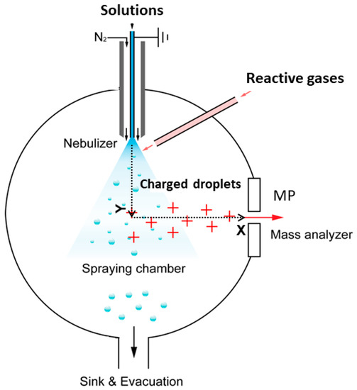 Because our experimental setup and experiments have been described in several publications from our laboratories [12,13,14,15,16], here we focused on their essential features. At the outset, we wish to emphasize that electrospray ionization mass spectrometers are not all alike. Therefore, it is crucial to report the particular configuration of the mass spectrometer used in each case, and the specific experimental conditions under which results were obtained. Key differences are whether the nebulizer is grounded or not, and whether the liquid microjets are directly ejected (along the X-axis) (see Figure 1) towards the inlet orifice in the metal plate (MP) that separates the spraying chamber from the low pressure section of the mass spectrometer, along a perpendicular (Y-axis) direction, or in a Z-configuration [17]. Comparisons of results obtained using different instruments should always bear in mind these issues.