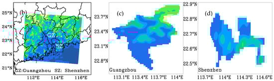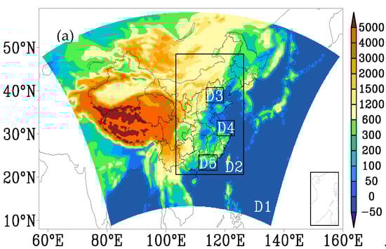 The simulated domain covers most of East Asia with a 30 km resolution (D1). As urban-surface-expansion is mainly located over eastern China, accompanying rapid economic development, the first nested domain covers most of eastern China (D2). The three second-nested-domains cover three city clusters (D3: BTH, D4: YRD, and D5: PRD) displaying the largest proportion of gross domestic product and intense human activity. The terrain elevation over the simulated domain, the PRD region (including Guangzhou and Shenzhen city), and two cities are displayed in Figure 1a–d.