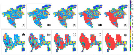 Spatial distributions of different land-use categories in (a–e) Guangzhou and (f–j) Shenzhen in the years of (a,f) 1980, (b,g) 1990, (c,h) 2000, (d,i) 2010, and (e,j) 2016, where red denotes urban surface grid cells. Land use categories are: (1) evergreen needleleaf forest, (2) evergreen broadleaf forest, (3) deciduous broadleaf forest, (4) mixed forests, (5) closed shrublands, (6) open shrublands, (7) woody savannas, (8) grasslands, (9) permanent wetlands, (10) croplands, (11) urban and built-up areas, (12) cropland/natural vegetation mosaic, (13) barren or sparsely vegetated areas, and (14) water. Source: [].