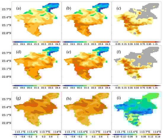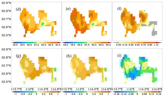 Spatial distributions of (a,b) T4 and (d,e) Txn, and (g,h) the corresponding differences (Txn minus T4) under (a,d,g) EX1 and (b,e,h) EX2 for 1980 and 2016. (c,f) The 37-year averaged warming for (c) T4 and (f) Txn, and (i) the corresponding differences over Shenzhen (oblique line denotes passing the 90% confidence level significance t-tests, units: °C).