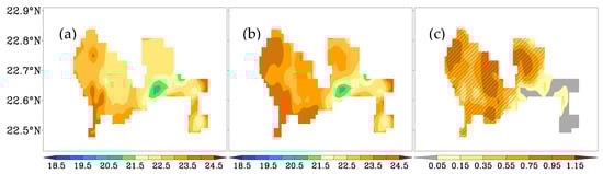 Spatial distributions of annual mean SAT under EX1 (Figure 3a and Figure 4a) and EX2 (Figure 3b and Figure 4b) for 1980 and 2016 and the warming between EX1 and EX2 (Figure 3c and Figure 4c) calculated using T4 are similar to those calculated using Txn (Figure 3d–f and Figure 4d–f) over both Guangzhou (Figure 3) and Shenzhen (Figure 4). Of these, only the warming mainly located over the southwestern part of Guangzhou passes the 90% confidence level significance t-tests (Figure 3c,f), whereas the warming occurs across nearly the entire Shenzhen area (Figure 4c,f), excluding the areas over the southeastern past of Shenzhen. Annual mean SAT values calculated using Txn are larger than those calculated using T4 (Txn minus T4) under EX1 (Figure 3g and Figure 4g) and EX2 (Figure 3h and Figure 4h) across the entire Guangzhou (Figure 3g–h) and Shenzhen (Figure 4g–h) areas, excluding the northwestern areas under EX2 over Shenzhen. In comparison, the 37-year averaged warming calculated using T4 is weaker than that calculated using Txn over Guangzhou (Figure 3i) and Shenzhen (Figure 4i), excluding over the middle-northern areas of Shenzhen, whereas significant differences only appear in southeastern and northwestern Guangzhou.