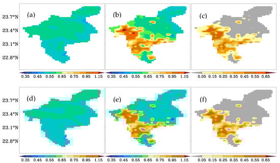 Spatial distributions of the trends under EX1 (Figure 5a and Figure 6a) and EX2 (Figure 5b and Figure 6b) for 1980 and 2016, and the urban-related warming contributions between EX1 and EX2 (Figure 5c and Figure 6c) calculated using T4, are similar to those calculated using Txn (Figure 5d–f and Figure 6d–f) over both Guangzhou (Figure 5) and Shenzhen (Figure 6). The urban-related warming is mainly located over southwestern Guangzhou (passing the 90% confidence level significance t-tests, Figure 5c,f), whereas the urban-related warming covers the entirety of Shenzhen, excluding the southeastern part (Figure 6c,f). The trends calculated using Txn are generally smaller than those calculated using T4 across the entire Guangzhou (Figure 5g–h) and Shenzhen (Figure 6g–h) areas under EX1 (Figure 5g and Figure 6g), excluding areas in northeastern Guangzhou, and EX2 (Figure 5h and Figure 6h), excluding middle-northern areas of Shenzhen. The urban-related warming contributions calculated using Txn are generally weaker than those calculated using T4 over both Guangzhou (Figure 5i) and Shenzhen (Figure 6i), excluding the middle-northern areas over Shenzhen.