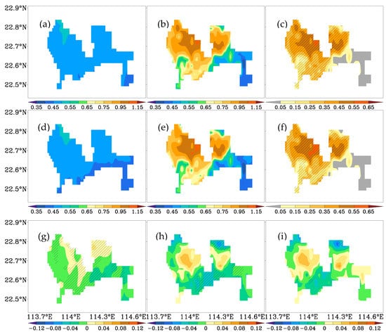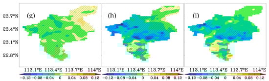 Trends in (a,b) T4 and (d,e) Txn, and (g,h) the corresponding differences (Txn minus T4) under (a,d,g) EX1 and (b,e,h) EX2 for 1980 and 2016. (c,f) The urban-related warming contributions for (c) T4 and (f) Txn, and (i) the corresponding differences over Shenzhen (oblique line denotes passing the 90% confidence level significance t-tests, units: °C/decade).
