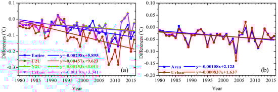 Surface air temperature at 2 m (SAT) plays a primary role in the climatic systems, and has been widely regarded as an important climatic indictor in daily human life. The frequencies and intensities of extreme climatic events relating to SAT, such as heat waves and low temperatures that act as meteorological disasters and influence human health [,,], have increased in recent decades. Increasingly more people are being aggregated in cities, where the urban heat island (UHI) has been widely observed over areas with intense urban surface expansion and human activities [,,]. The UHI effect is primarily attributed to the conversion of land surfaces from non-urban to urban surfaces (N2U), for which the warming over the N2U areas is generally larger than that over areas classified as urban surfaces in both time periods (U2U) and areas with unchanged land use categories [,]. To objectively evaluate urban-related warming and the corresponding contributions to regional warming over different land surface characteristics, SAT, as a direct indicator, should be comprehensively observed and calculated.